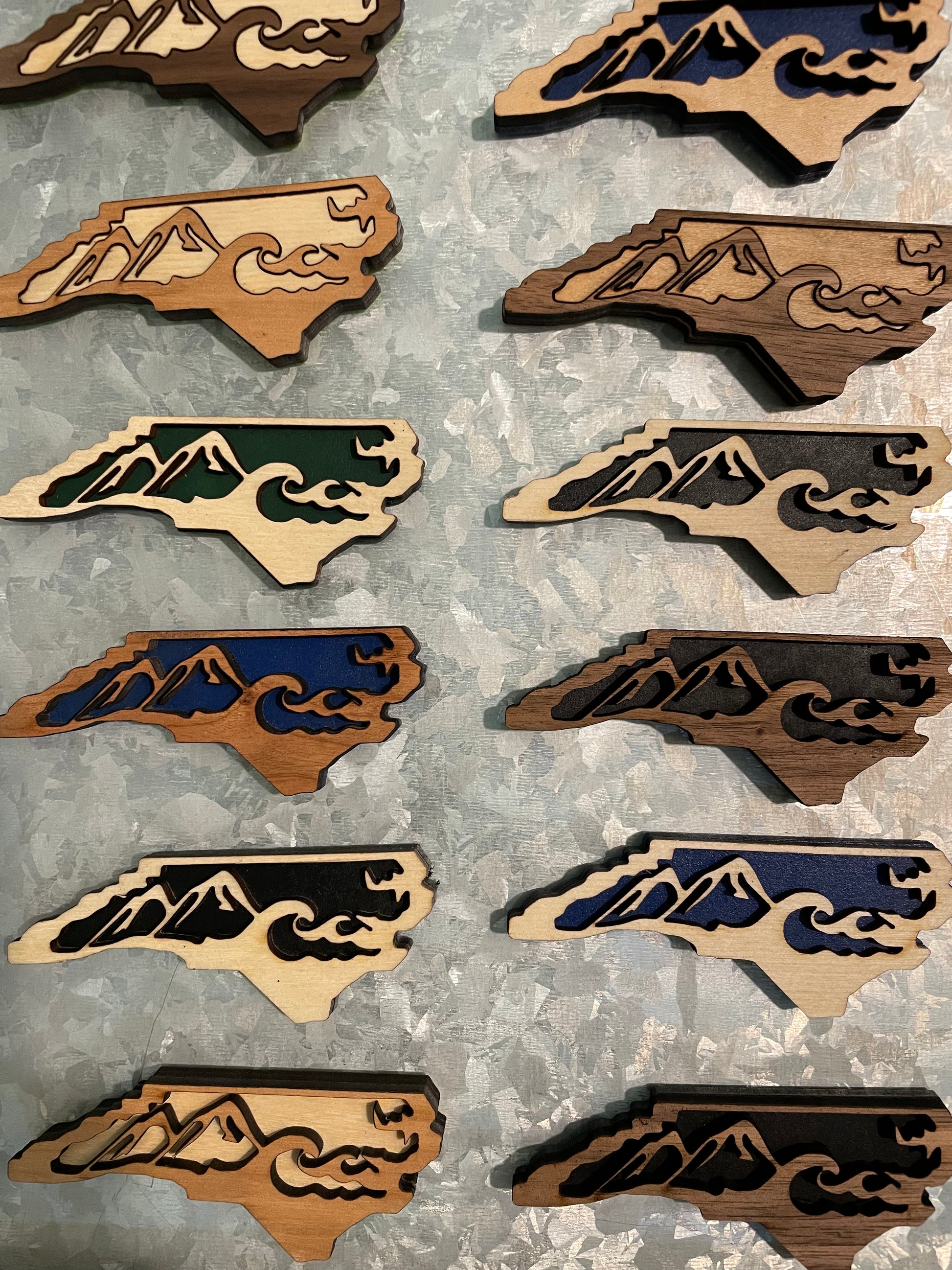This 3-1/2" wooden magnet resembling North Carolina, complete with mountains and ocean. Its unique shape and intricate details make it a perfect addition to your collection.